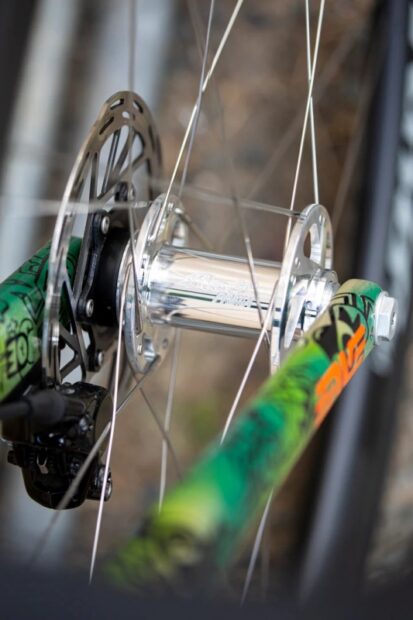 眩しい程にピカピカのハブとカーボンリムとの組み合わせがとても渋い!