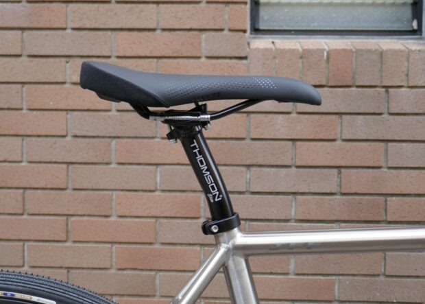 シートポストは、一目でそれと分かるTHOMSONの今回は耐久性重視でELITEシリーズのセットバックモデル。